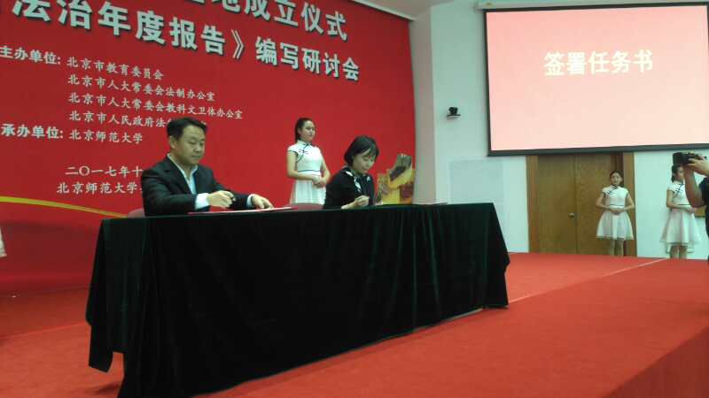 基地”从学科建设、人才培养、团队建设、科研成果和学术交流等方面介绍了我院基地建设的基本情况。之后北京市教育委员会、北京市人大常委会法制办公室、北京市人大常委会教科文卫体办公室、北京市人民政府法制办公室的相关领导分别向四个基地进行了授牌并签订任务书。校长助理郭洪林代表我校接受基地授牌。申素平教授代表我校基地签署基地建设任务书。