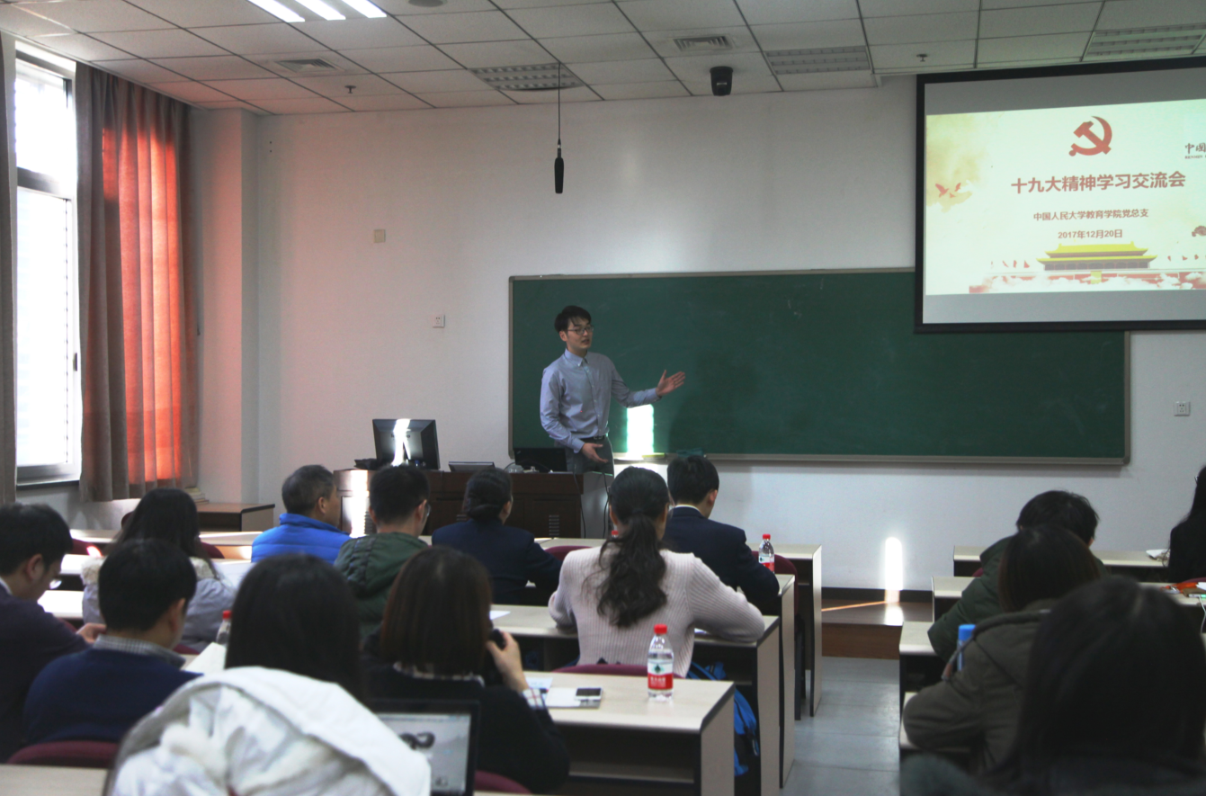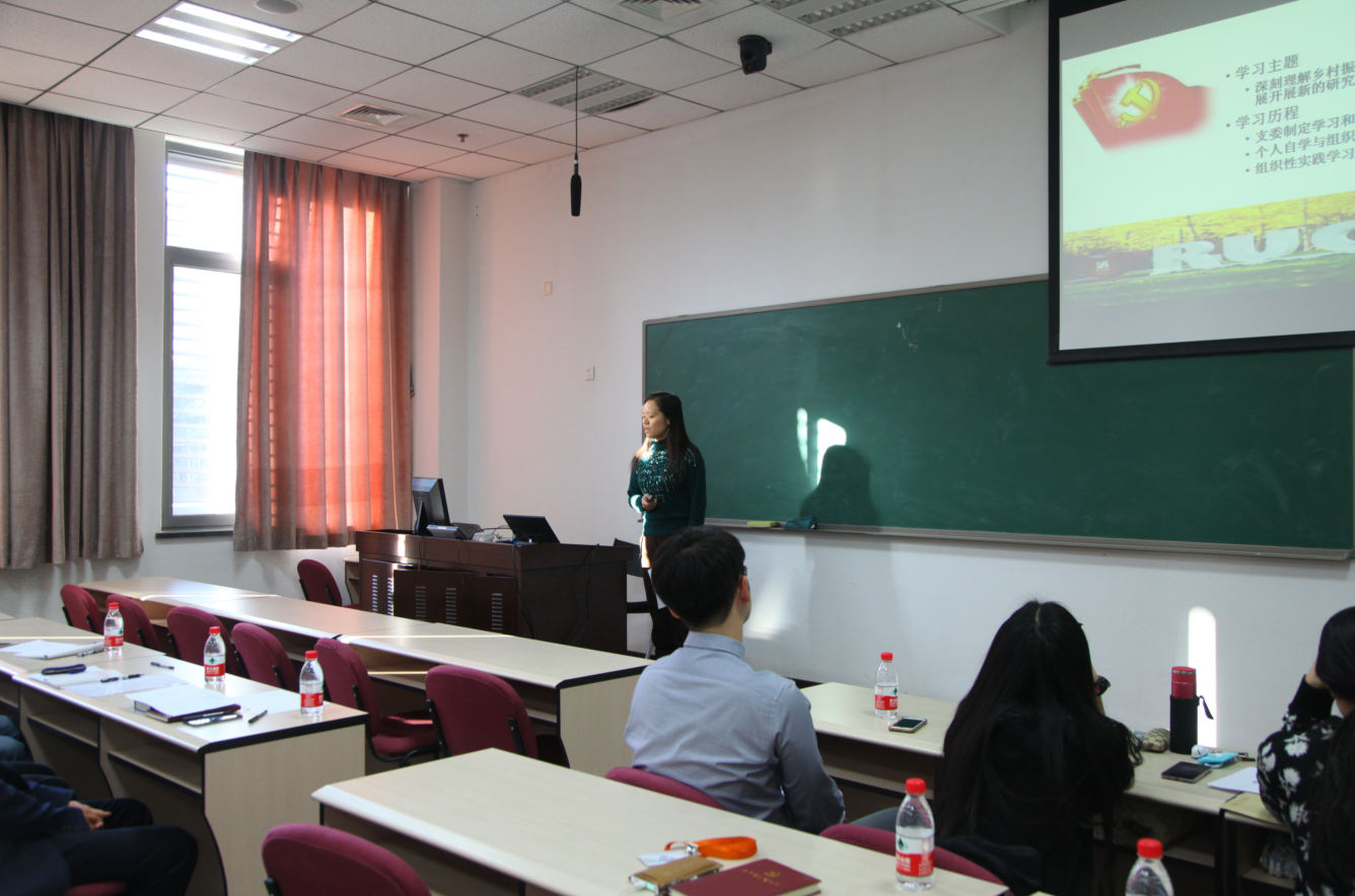 胡莉芳老师代表教师第一党支部汇报了他们的学习和开展的活动如教师代表参加学习讲座,与大兴君谊中学师生召开管理改革模式研讨会,参加“纪念一二∙九,植物园参观活动”等。在专题解读部分,教职工第一党支部选择了“农村教育”的主题,结合十九大报告中的建设教育强国战略和建设教育强国“两步走”战略,分析了农村教育短板的客观现状,并从财政投入、师资队伍建设和硬件设施完善等方面提出了建议。