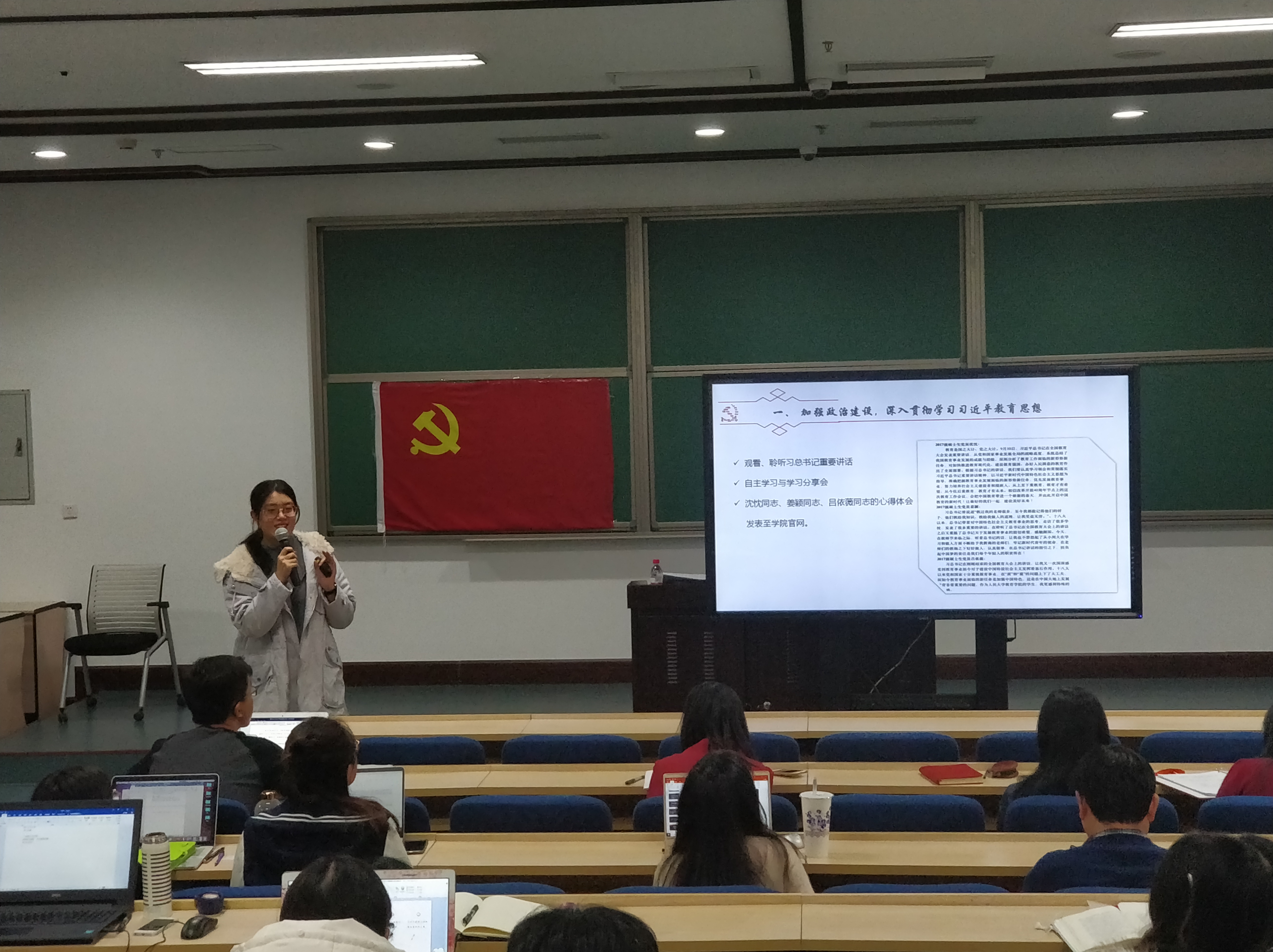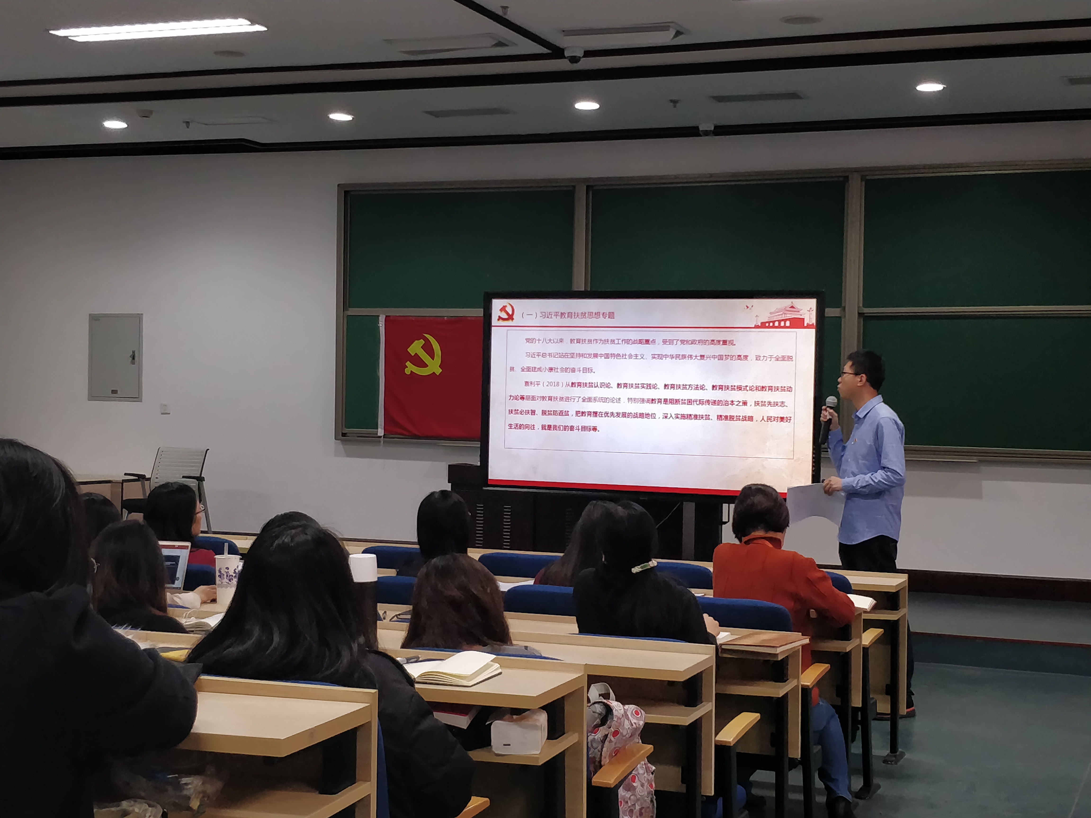 2018级硕士生党支部书记陈曦从支部成立、支部建设和支部学习成果三个方面对本学年的支部活动进行总结和回顾。2018级硕士生党支部以支部三个党小组为依托,通过专题理论学习、朋辈互助工作坊、正定实践活动和“一二·九”青春歌会等形式将理论与实际相结合,在创新组织活动的基础上有效提升党员的理论素养。2018级硕士生党员赵阔根据支部学习情况阐述了习近平总书记关于教育的重要论述的内涵和理论渊源,并通过对政策文本的解读和鲜活案例的分析,集中展示了支部党员就习近平总书记关于教育扶贫、高等教育重要论述的理论学习成果。