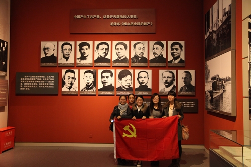在中共一大的各代表照片前,同学们主动拿出党旗,与珍贵的历史瞬间合影留念。