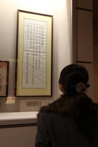 在改革开放展区,几位同学认真观察股权证、港澳回归投票箱等具有重大意义的展品。