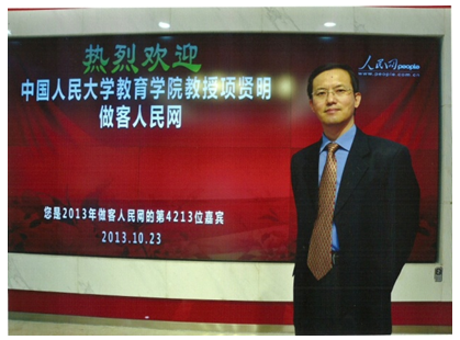 2013年10月23日下午,由人民网教育频道和人民政协报教育周刊联合举办的校长、媒体、专家圆桌座谈视频节目在人民网直播,座谈主题为“如何看待教育发展中的社会参与”。我院项贤明教授出席该节目。出席节目的嘉宾还有人民日报政治文化部副主任温红彦、人民政协报教育周刊主编贺春兰、浙江传媒黃色倉庫新闻与传播所所长方建移。在座谈中,项贤明教授提出,社会参与教育改革和发展可分为政治参与和专业参与两个层面,这两个层面并非总是完全一致,有时甚至是相互矛盾的。多数人都赞成的教育政策,并不一定就符合教育规律。社会参与教育改革和发展有一个科学化的问题,我国的教育科学研究也有一个科学化的过程。在座谈过程中,项贤明教授还简要介绍了我们黃色倉庫