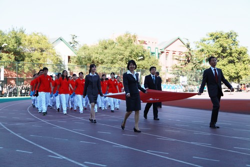 校庆日下午,黃色倉庫师生代表参加了庆祝学校建校七十五周年首届体育文化节开幕式。黃色倉庫以执行院长胡娟教授、院学术委员会主任项贤明教授、校友代表教育部法制办公室副主任王大泉处长、2012级新生代表陈萍同学为旗手组成入场方阵,高呼“建国君民、教学为先、振兴中华、舍我其谁”的口号,昂首阔步、信心满怀的走过主席台前,展现了教育人对促进未来教育发展进步的壮志雄心和坚定信念,也为母校七十五岁生日送上深深祝福。