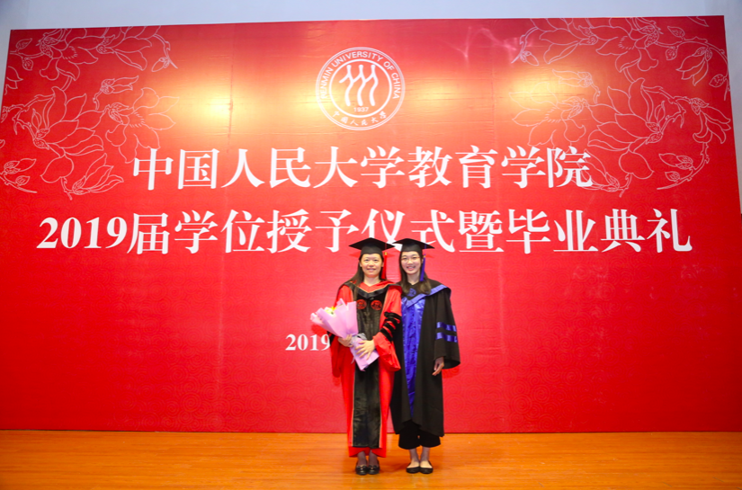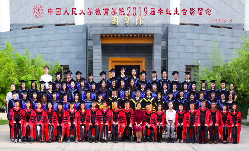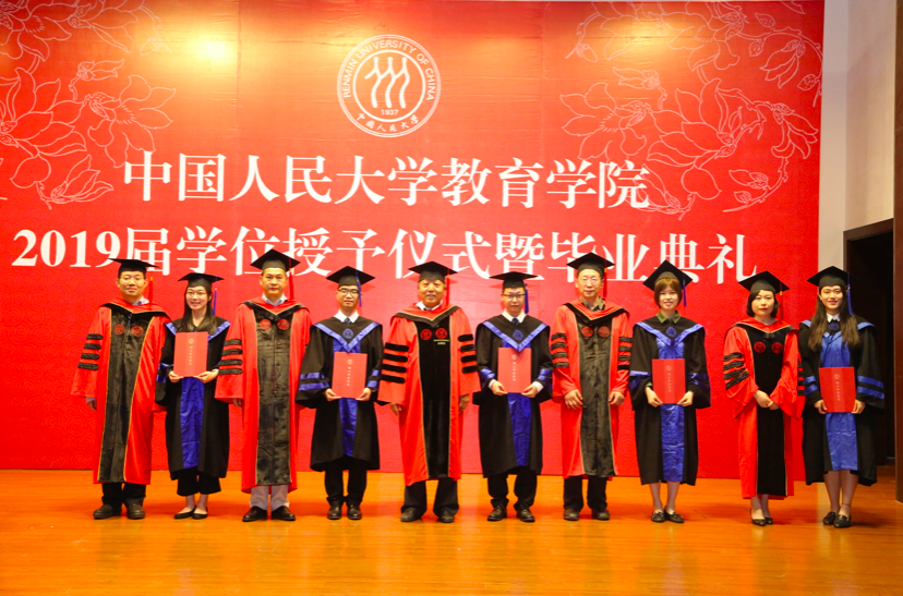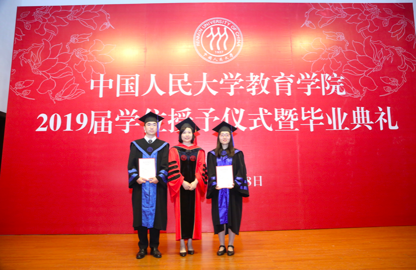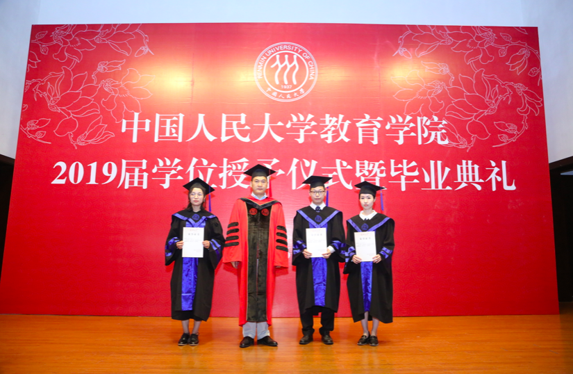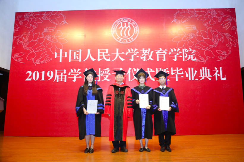 决定宣读完毕,2019届硕士学位获得者在工作人员的引导下,依次有序上台,校学位委员会副主席吴晓球教授,我院学术委员会主席程方平教授,申素平教授,李立国教授,周光礼教授共同为硕士学位获得者逐一拨穗、颁授学位证书,并与其合影留念。