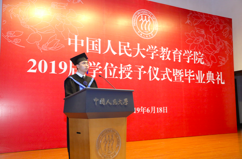 2017级硕士研究生班班主任詹宏毅老师作为教师代表致辞。他结合自己的人生感悟和专业思考,希望同学们在通过教育实现个人收益外,还要重视教育的社会收益。同时,他希望同学们不管毕业后是否从事教育事业,都能够不忘初心,始终重视教育、关注教育、支持教育,用自己的日常言行影响身边的家人、朋友和同事。最后,詹老师用一首诗回顾了与2019届硕士毕业班两年来相处的点点滴滴,记录了师生共进的一个个感动瞬间,并向毕业生们的未来寄予美好期盼与祝福。
