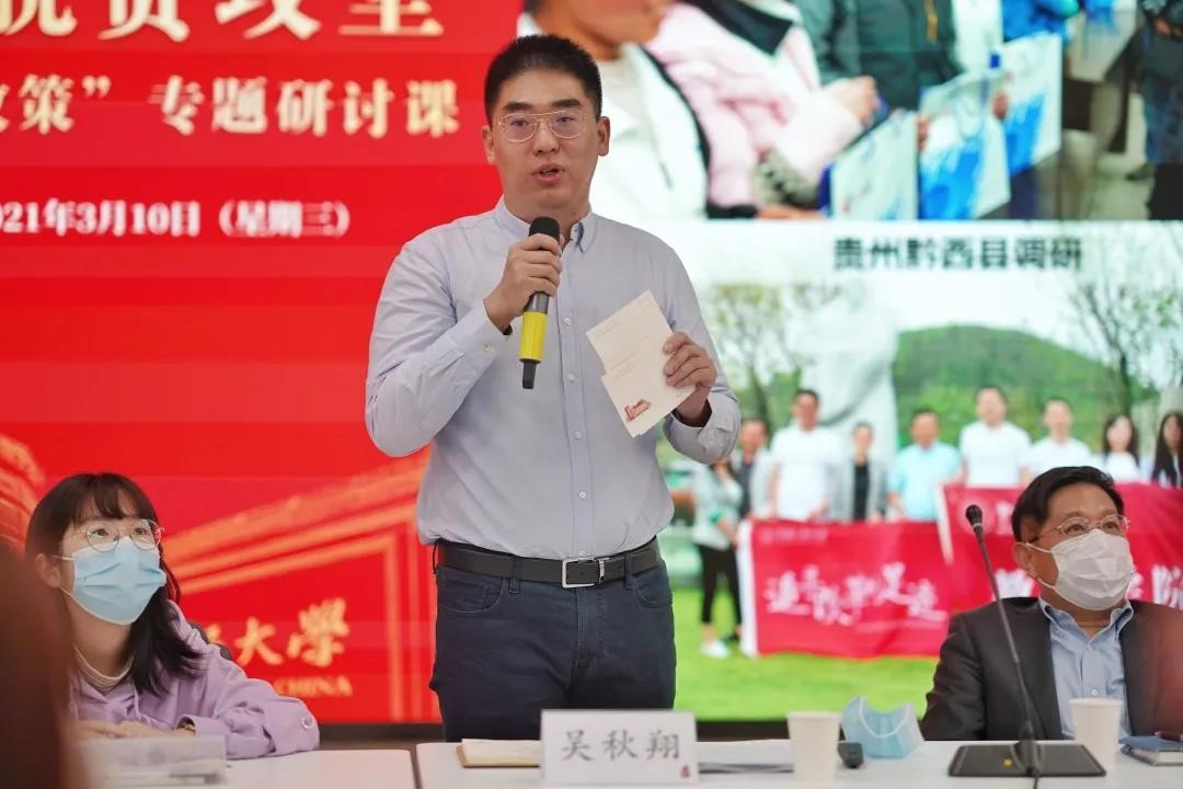 3月10日下午,新学期第一讲“形势与政策”专题研讨课开讲,党委书记靳诺、副校长胡百精主讲。本次“形势与政策”专题研讨课以“决胜脱贫攻坚”为主题,讲述脱贫攻坚中的人大故事。我院2017级博士生吴秋翔作为研究生支教团成员代表,以《脱贫攻坚,青年学子有何为》为主题分享了自己在兰坪支教的经历和故事,并与同学们共同探讨脱贫攻坚过程中青年一代的使命与担当、责任与奉献。