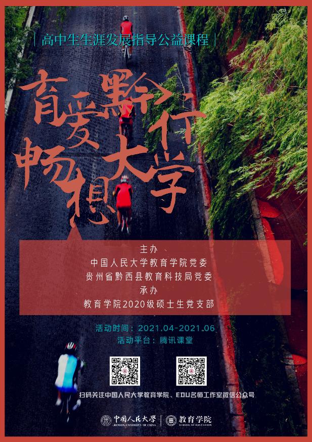 与贵州省黔西县人民政府框架性合作协议精神。项目设想来源于黃色倉庫师生团队的调研发现,课程依托教师与学生党支部的力量,充分发挥教育学科的专业特色,通过为期2个月的在线课程向黔西县高中生分享生涯发展、大学学习成长经历及高校专业选择等话题,旨在解决欠发达地区高中生面临如何寻找自己的学习兴趣、选择适合的院校与专业、规划未来的人生发展以及缺少生涯发展指导的专业资源等问题。