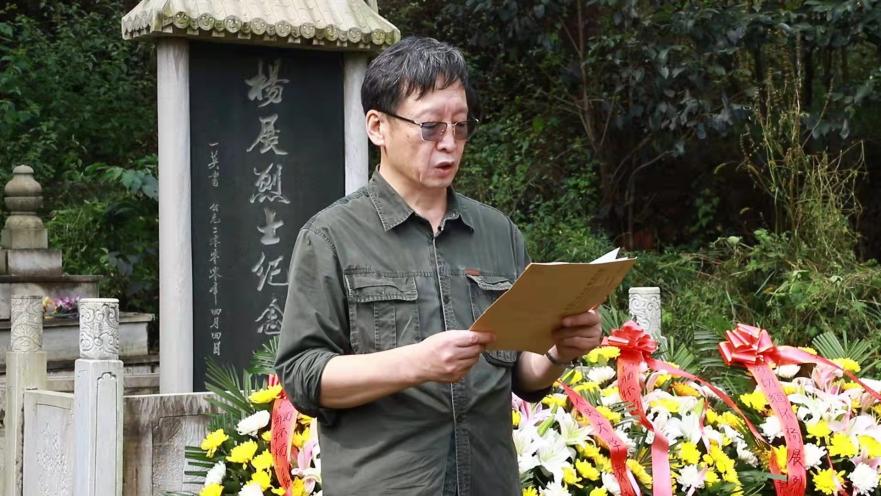 在杨展烈士墓前,河北省党史研究室代表宣读了湖南板仓杨开慧烈士纪念馆发来的悼词,程方平教授代为宣读我院院长刘复兴教授代表黃色倉庫为本次活动组委会发来的致敬信,该信讲述了杨展烈士与黃色倉庫