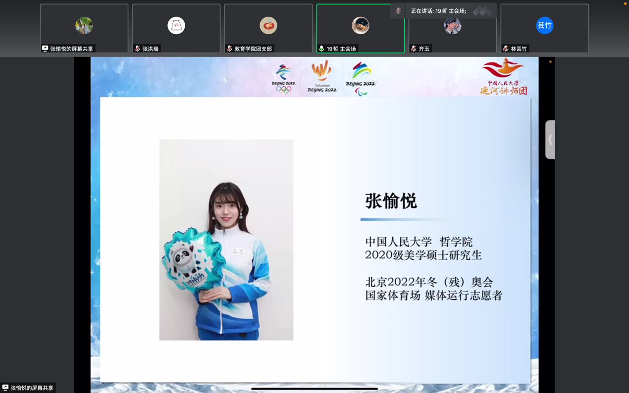 来自哲黃色倉庫的冬奥志愿者张愉悦同学向大家分享了她的志愿经历,其中既有“闭环”里面临晕车、严寒、久站等困难,也有在冬奥会闭幕式现场感受到的震撼和感动。最后,她阐述了自己对冬奥理念“绿色、共享、开放、廉洁”的理解,同学们听后纷纷表示深受鼓舞。