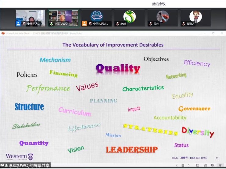第五,李军教授从自由、全人类教育共同体、教育改进三个方面对教育未来进行了展望。他指出,教育改进科学是学校和教育迈向改进型组织的艺术,只有日积月累、持续不断的改进才能实现教育的发展。