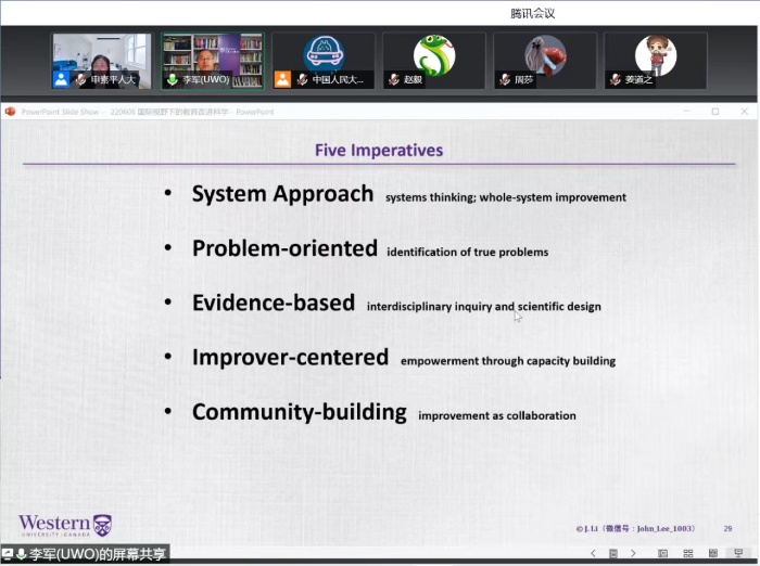 第三,教育改进科学的知识构成分为学科知识(subject matter knowledge)和专业知识(profound knowledge)两部分,二者结合才可以提升改进力。教育改进科学有系统思维、问题导向、循证基础、改进者为中心和教育共同体构建等五大重要原则。李军教授围绕每个原则进行了详细阐述,并强调了研究者个人改进能力提升对教育改进共同体构建的重要性。