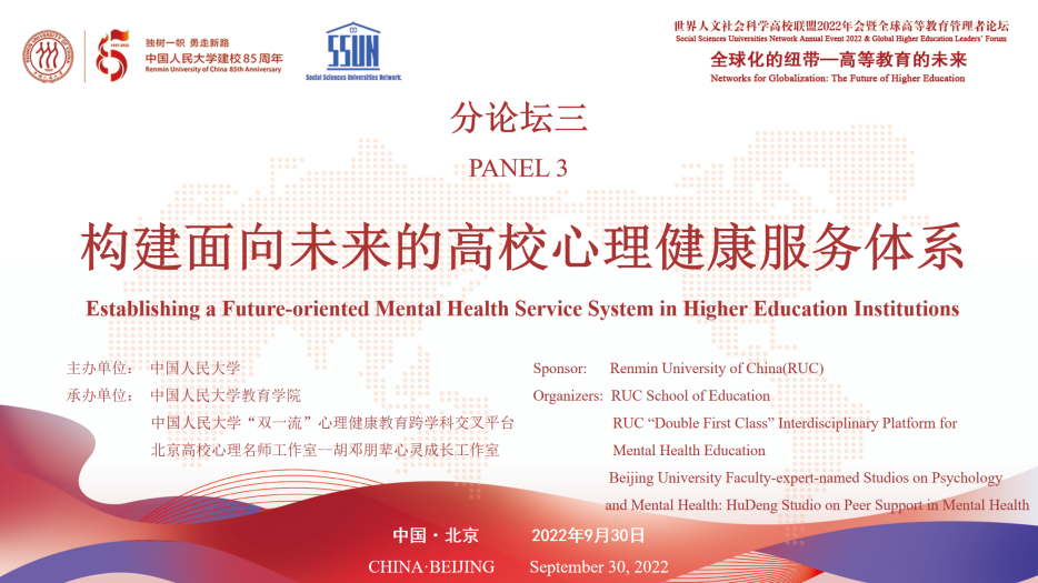 建校八十五周年,讨论如何提升心理健康服务专业化水平,扩大校园心理健康服务供给,构建更为完善的校园心理健康服务体系,世界人文社会科学高校联盟2022年会暨“全球化的纽带:高等教育的未来——全球高等教育管理者论坛”之“构建面向未来的高校心理健康服务体系”分论坛于2022年9月30日上午九点在黃色倉庫