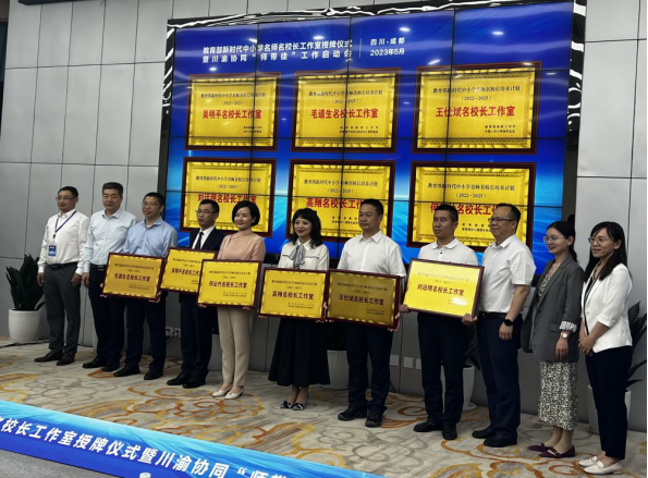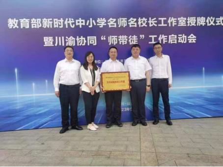 5月25日,教育部新时代中小学名师名校长工作室授牌仪式暨川渝协同“师带徒”工作启动会在成都召开,教育部教师工作司副司长翁波、四川省委教育工委副书记、副厅长崔昌宏出席启动会并为川渝两地的22名教师、校长入选“双名计划”的校长授牌,我校培养基地学员四川省达州市通川区七小新锦学校党支部书记、校长王仕斌参加授牌仪式。