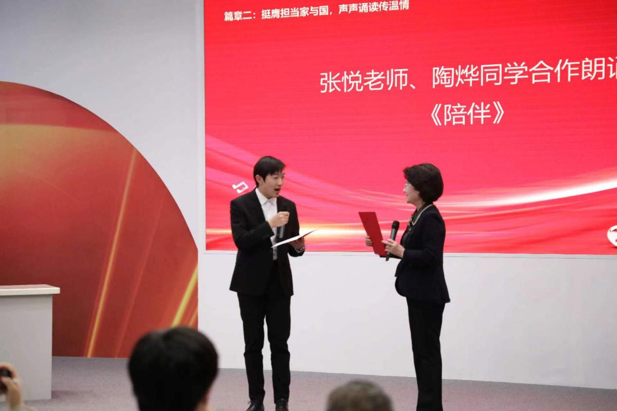 接下来,张悦老师和陶烨同学为大家合作朗诵了一首名为《陪伴》的小诗,以孩子和母亲对话的形式,展现了成长路上的温情与点滴,饱含深情,催人泪下。