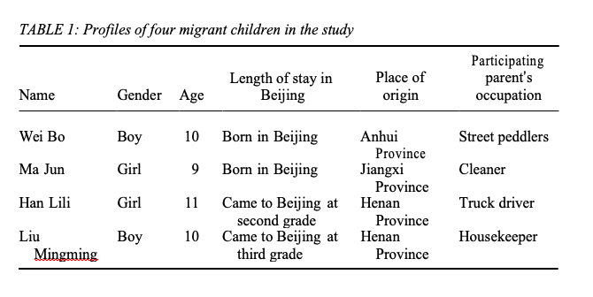 There are several obvious limitations with this approach. The strengths of prolonged ethnographic fieldwork come from the depth and richness of the data obtained. However, the case study approach focusing on only four migrant children inevitably leads to the limited generalizability of the study. Thus, in presenting the findings below, we take caution to avoid over-generalization and engage more in ‘thick descriptions’ (Maxwell, 1996).