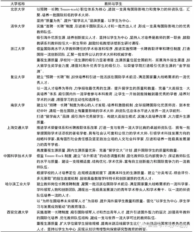 师资质量是决定本科教育质量的第一要素。随着高等教育的国际化, 一流大学师资配置是以全球为舞台的。建设一流本科要求建设一流师资队伍。为此, “双一流”建设高校必须在全球范围寻找人才, 提供有竞争力的条件 (薪水、设备、实验室、学生、图书馆等) 。作为研究型大学, “双一流”高校要求其教师从事高水平的科研, 热心教学工作。这是因为一流本科教育要求科教融合, 要求以学生为中心的师生互动, 使学生受到学术熏陶, 广泛接触新思想。因此, 除了上课, “双一流”高校的教师与本科生、研究生在实验室、科研项目或小型研讨会上一起工作, 努力向学生介绍最新进展, 积极关心学生的学习和成长, 对学生严格要求。“双一流”建设方案表明 (表2) , C9高校普遍采用国际化战略建设一流教师队伍。所有学校都实行国际学术职业管理中的“准聘-长聘”制度, 按照世界一流标准在全球范围内寻找和招聘一流教师。