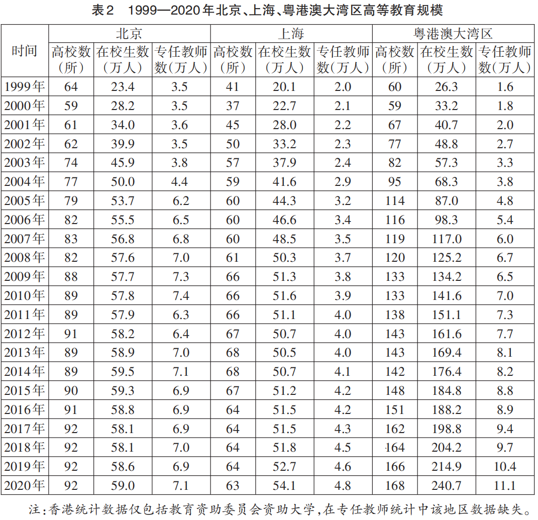 1.高等教育规模。表2呈现了北京、上海及粤港澳大湾区的高等教育规模。统计显示:①高校扩招以来,北京、上海、粤港澳大湾区的高等教育规模不断扩大,且粤港澳大湾区扩张态势突出,高校数量由1999年的60所增加至2020年的168所,普通高等学校在校生人数由26.3万人增加至240.7万人,普通高等学校专任教师数由1.6万人增加至11.1万人。②结合经济发展状况,相同经济规模下粤港澳大湾区高等教育规模远低于北京、上海。1999年三地在校生人数与GDP的比值分别为0.85%、0.48%、0.13%。③结合人口分布情况,2020年北京、上海、粤港澳大湾区每万人在校生数分别为272人、217人、265人。