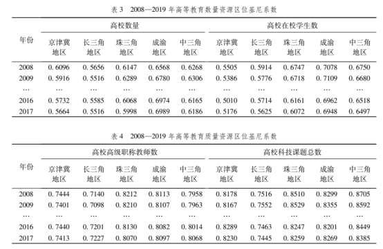 对比不同城市群的区位基尼系数可知,长三角地区无论是数量资源还是质量资源在五大城市群内均是分布最为均衡的,这与长三角地区多个经济文化强市的共同发力密不可分。成渝地区高等教育数量资源最集聚,这与重庆和成都的超强政治经济地位相匹配。京津冀地区并未出现一枝独秀的格局,这与天津高等教育资源丰富息息相关。