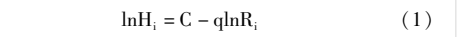 其一,空间测度的规模-位序法。本文采用城市理论中的规模-位序法对高等教育资源的中心分布情况进行测量。规模-位序律反应城市规模与其所处排序存在的规律关系,具体计算方法如式(1)所示。其中,Hi为按照地区高等教育资源规模排序后,第i位城市的高等教育资源规模,Ri是第i位城市的位序,C为常数,q为回归系数。若q>1,说明高等教育资源在研究范围内服从单中心分布,核心城市突出;若q<1,说明高等教育资源在研究范围内服从多中心分布,高等教育资源分布较为均衡;若q=1,说明高等教育资源的空间分布完全服从普夫(Zipf)法则。