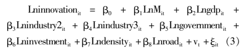 其三,区域创新能力影响因素回归模型建构。已有研究表明,区域创新能力除了受高等教育资源空间布局的影响外,还受地区经济水平、产业结构、政府科技支出、外商直接投资、集聚经济、基础设施的影响。基于此,本文结合数据可获得性构建回归模型,如式(3)所示。其中:被解释变量(innovationit)为城市群创新能力,用专利授权数表示;核心解释变量(Mit)为高等教育资源空间布局。本文分别衡量高等教育数量资源、质量资源的规模分布情况与空间集聚程度,最终形成四个核心解释变量,即高等教育数量资源规模分布、高等教育质量资源规模分布、高等教育数量资源空间集聚、高等教育质量资源空间集聚;控制变量(Zit)包括地区经济水平(gdp)、产业结构(industry)、政府科技支出(government)、外商直接投资(investment)、集聚经济(density)、基础设施(road)六个指标。u、v为个体和时间固定效应,i、t为地区及年份,ξ为扰动项。