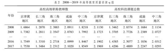 由于五大城市群的城市数量不同,本文参照最小城市数方便进行比较,计算各城市群前9位城市的q值(见表1和表2)。总体来看,高等教育质量资源的q值均高于数量资源,质量资源的单中心分布现象更为突出,各城市群高等教育资源的q值具有显著差异。由于十年间q值并未发生巨大变化,因此,表格做部分省略处理。从高校数量和高校在校生数两个指标来看,除长三角地区外,各城市群高等教育质量资源的q值集中在1.3—1.6这一区间,呈现单中心分布,且珠三角地区、成渝地区高等教育数量资源q值最高,两地区高等教育数量资源呈现两极化趋势;长三角城市群表现出明显不同的分布特点,高校数量和高校在校生数的q值最低,在1附近波动,表现出典型的多中心分布形态,可以得知长三角地区高等教育数量资源分布较为均衡。从高校高级职称教师数和高校科技课题总数两个指标来看,除长三角地区外,各城市群高等教育质量资源的q值集中在1.8—2.8这一区间,呈现单中心分布。即使在长三角地区,q值也在1.3—1.5之间,虽然集中程度相对较低,但也呈现单中心分布。珠三角地区、成渝地区、中三角地区高等教育质量资源的q值大于2,单中心集聚明显,说明在科研力量层面,五大城市群呈现出局部集中的现象,且集中程度相较于数量资源更高。2008—2017年,大部分城市群高等教育资源q值呈下降趋势,逐渐向多中心分布转化,集聚程度均有所降低。