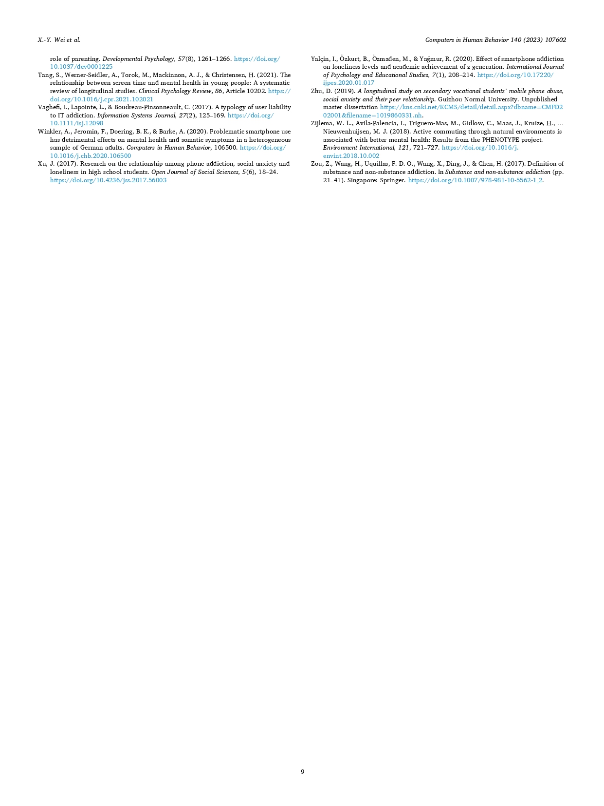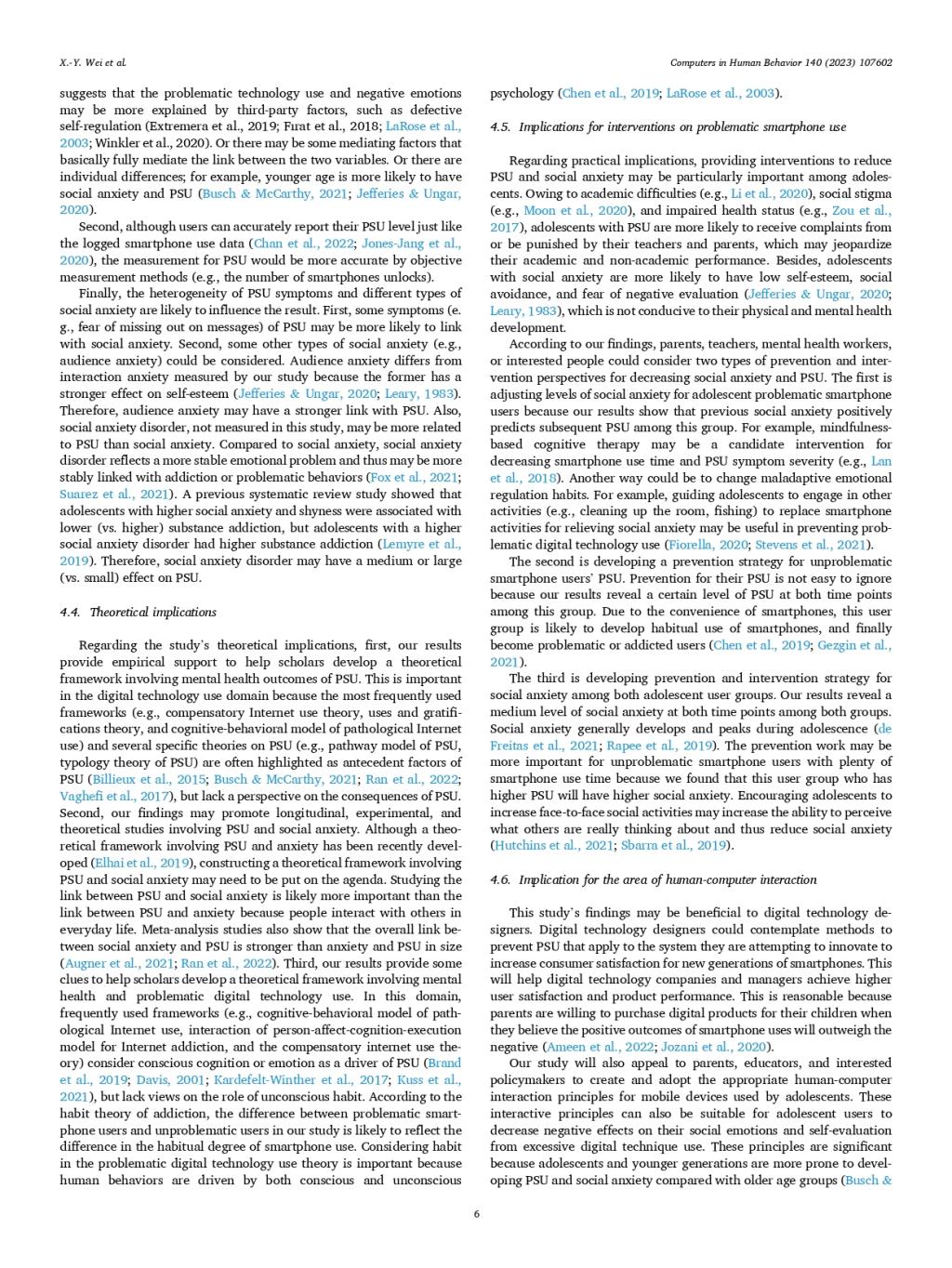 ABSTRACT:Smartphone provides diverse indirect communication channels for users, which may attract people with social anxiety. Due to the high risk of developing social anxiety and problematic smartphone use (PSU) in adolescence,it is important to investigate whether social anxiety will trigger PSU or vice versa among this group in the smartphone era. Also, most previous PSU studies include amounts of unproblematic smartphone users in the analyses, which may“muddy the waters.”Participants were 582 adolescent smartphone users (including 201 problematic users) who completed the investigation at time 1 (T1) and time 2 (T2). A bias-corrected factor score path analysis (BCFSPA) was adopted to estimate data with small or moderate sample size. BCFSPA showed that social anxiety at T1 positively predicted PSU at T2 among problematic (vs. unproblematic) smartphone users.Also, PSU at T1 positively predicted social anxiety at T2 among unproblematic (vs. problematic) smartphone users. Our results have identified social anxiety as a risk factor for PSU among adolescent problematic (vs. unproblematic) smartphone users; the compensatory Internet use model combined with the habit theory of addiction can explain this finding. Besides, the dilution effect hypothesis can explain the effect of PSU on social anxiety among unproblematic (vs. problematic) smartphone users.