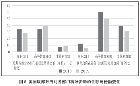 另一方面,具体到联邦政府研发资助支出(见图5),尽管联邦政府对各部门的研发资助由2010年至2019年大体呈现增加态势,但联邦政府在各部门的研发资助所占份额却呈现下降趋势。特别是高等教育机构,联邦政府在高等教育机构的研发资助份额由2010年的60%下降到2019年的50%。关键科技领域的科研发现与创新离不开基础研究,高等教育机构是基础研究的主体。由于高等教育机构的科学研究严重依赖联邦政府的支持,联邦资助比例的下降对高等教育机构实验室的开发、科研人才的培育和研究生教育均具有潜在的负面影响。