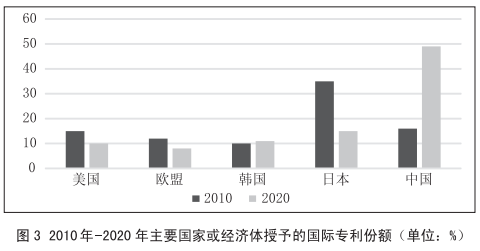其次,专利发明与创造能够为社会和经济带来直接利益,也是衡量国家科研成效的重要标准。美国国家科学基金会统计发现,专利发明从美国等高收入国家逐渐转移到中等收入国家。从2010年至2020年,授予高收入国家发明者的国际专利比例由78%降至48%。其中(见图3),美国在国际专利中的份额从15%降到10%,日本的份额从35%降到15%,欧盟国家的份额由12%降到8%。相比之下,中国在国际专利中的份额从2010年的16%增加到2020年的49%。