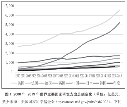 增加研发投入,促进科研成果产出和创新已经成为世界各国科技战略的共识。国家创新能力不仅要由能够开展技术先进活动的劳动力的发展来推动,还要由其对研发的资金投入来推动。在科研投入方面,美国科研投入在保持快速增长的同时,面临着来自其他世界主要国家的挑战。美国国家科学基金会(NFS)对全球科研绩效进行统计发现,全球研发投入由2000年的7260亿美元增加到2019年的2.4万亿美元,研发投入增加两倍。其中,2019年美国科研投入6560亿美元,中国为5260亿美元,两国的科研投入约占全球研发总投入的50%。通过对比2000年-2019年世界主要国家研发支出总额的变化(见图1)发现,近20年间,法国、德国、英国、日本、韩国、印度的研发支出保持缓慢增长趋势,而中国研发支出持续快速增长,并逐渐追赶美国。这是因为在大科学时代,研发投入巨大,需要雄厚的国力支撑,除中美之外,大部分国家开始选择“躺平”。