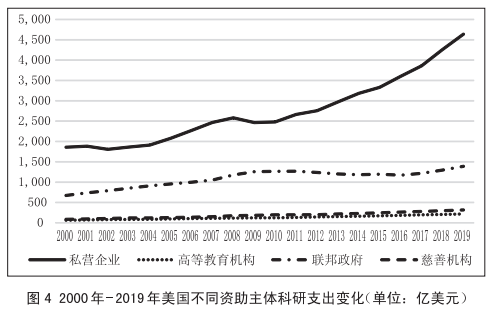 一方面,据美国国家科学基金会统计(见图4),近20年间,私营企业组成的商业部门一直是美国科学研究的主要资金来源和驱动力,为大部分应用研究和实验开发提供资金且研发支出持续增加;联邦政府是美国第二大研发资金来源,支持所有部门实施研发,特别是为高等教育机构开展基础研究提供资助;高等教育机构和慈善机构作为投资主体的科研资助支出则较少。由于关键科技领域的科学研究需要大规模的、持续的资金投入,而私营企业资助的科研多为应用研究和科学实验室,追求短期快速的经济效益。因此,当前美国以私营企业资金投入作为科学研究主要支持的科研资助模式,可能无法满足关键科技领域的竞争需要。