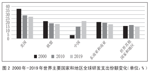 此外,美国科研支出的全球贡献受到以中国为代表的新兴经济体的挑战。美国在全球研发中的份额从2010年的29%下降到2019年的27%(见图2),而中国的份额从15%增长到22%。中国研发支出的年均增长率为10.6%,超越年均增长率5.4%的美国。